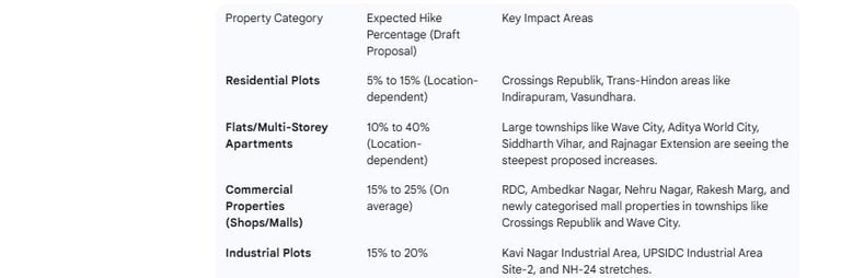 - Major Townships (Crossings Republik, Wave City, Siddharth Vihar): The large-scale, self-sufficient townships have driven up real market prices, necessitating a sharp correction in circle rates. Crossings Republik residential plot rates are slated to rise, and apartment rates in Wave City are set to see a steep increase to align with their strong market performance.